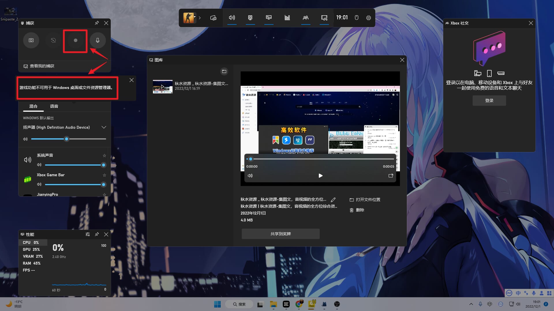 直接按住win+G就可以召唤出来windows的录屏界面,不过不能录制桌面和资源管理器,在任意的其他位置都是可以录制的