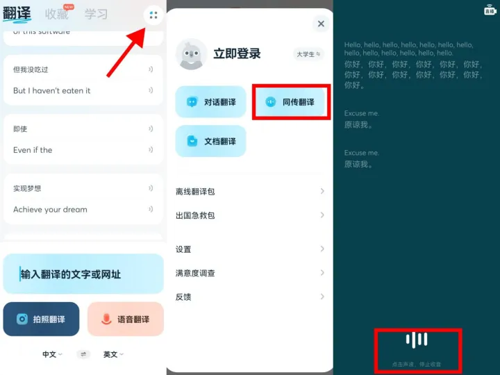 这个翻译APP肯定是我们大家都知道的,现在它的翻译板块已经非常丰富了。在这里,我们可以在软件的首页找到【同传】选项,也就是实时翻译,然后点击顶部设置汉英翻译的方向,再点击底部的麦克风按钮。这个时候我们会开始接收广播,然后识别翻译;完成后点击暂停,可以看到前后所有翻译的内容。不要怕翻两句,自动清理。