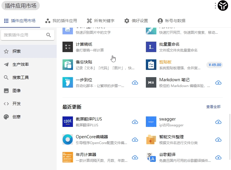 uTools是比Wox更进一阶的软件,是一个极简化、插件化的桌面软件,他通过众多的插件来提高你的工作效率,可以全局搜索,可以截图oCR等众多效率插件,也可以将常用程序固定到它的滚轮中键菜单来快速启动,想要使用更多的插件就到插件应用里去挑选就可以了